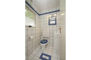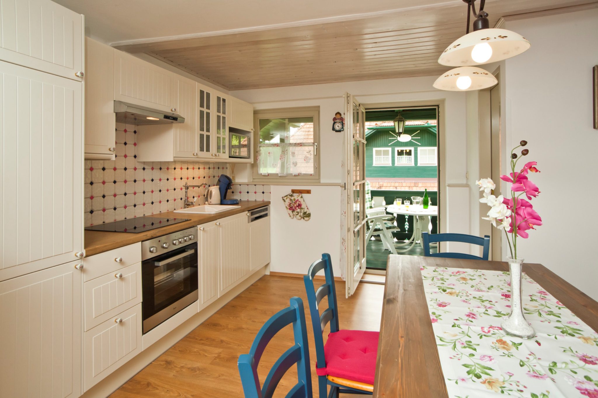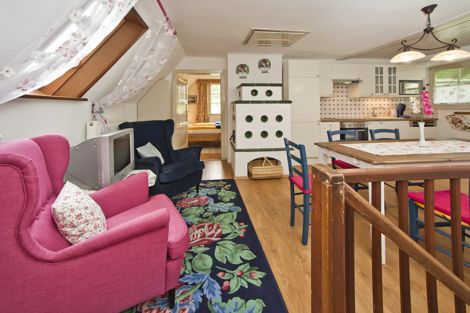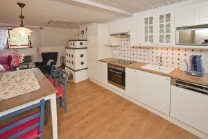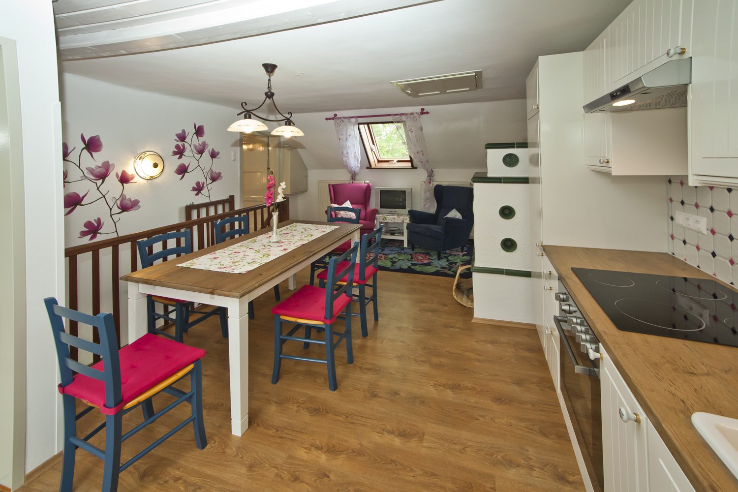• Wohnküche mit Esstisch, Kachelofen und TV